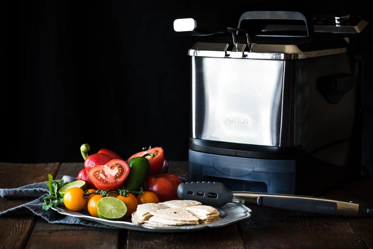 This post was made in partnership with PADERNO. The salsa quickly comes together using PADERNO’s 3-Cup Food Chopper and it’s Vortex Blade Technology to make chopping everything together perfectly. Tortilla chips are fried in the best deep fryer I think I’ve ever used. Seriously, I can’t get over how easy it is to clean. It has a 3.5 L oil capacity, perfect for family-sized meals and the auto-drain function drains the oil into a storage reservoir.
