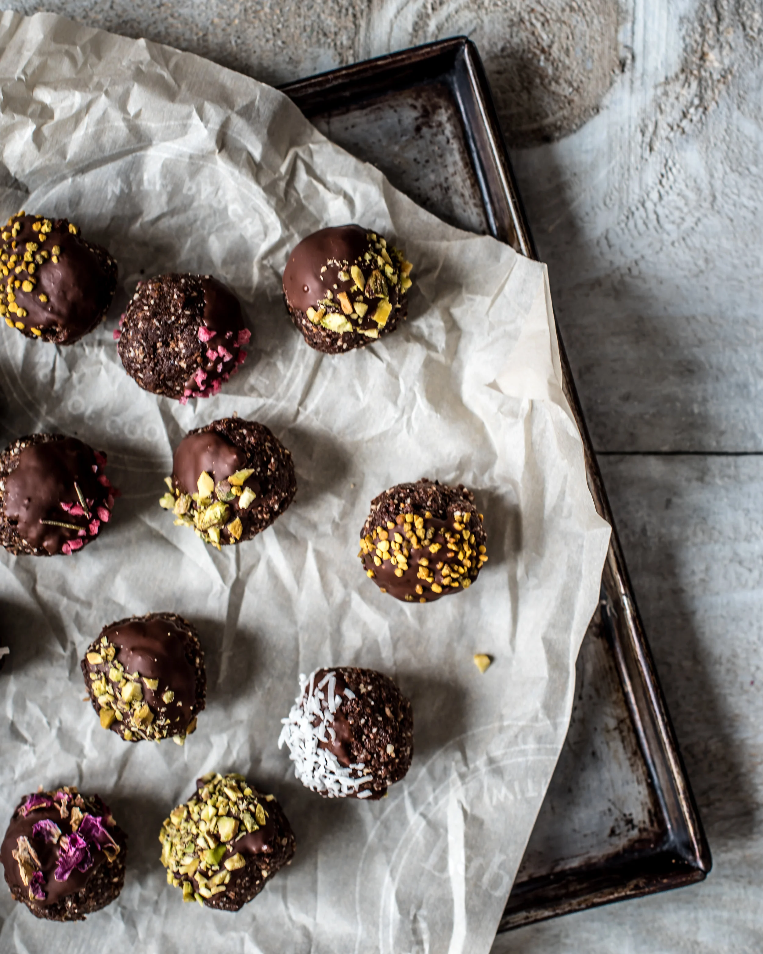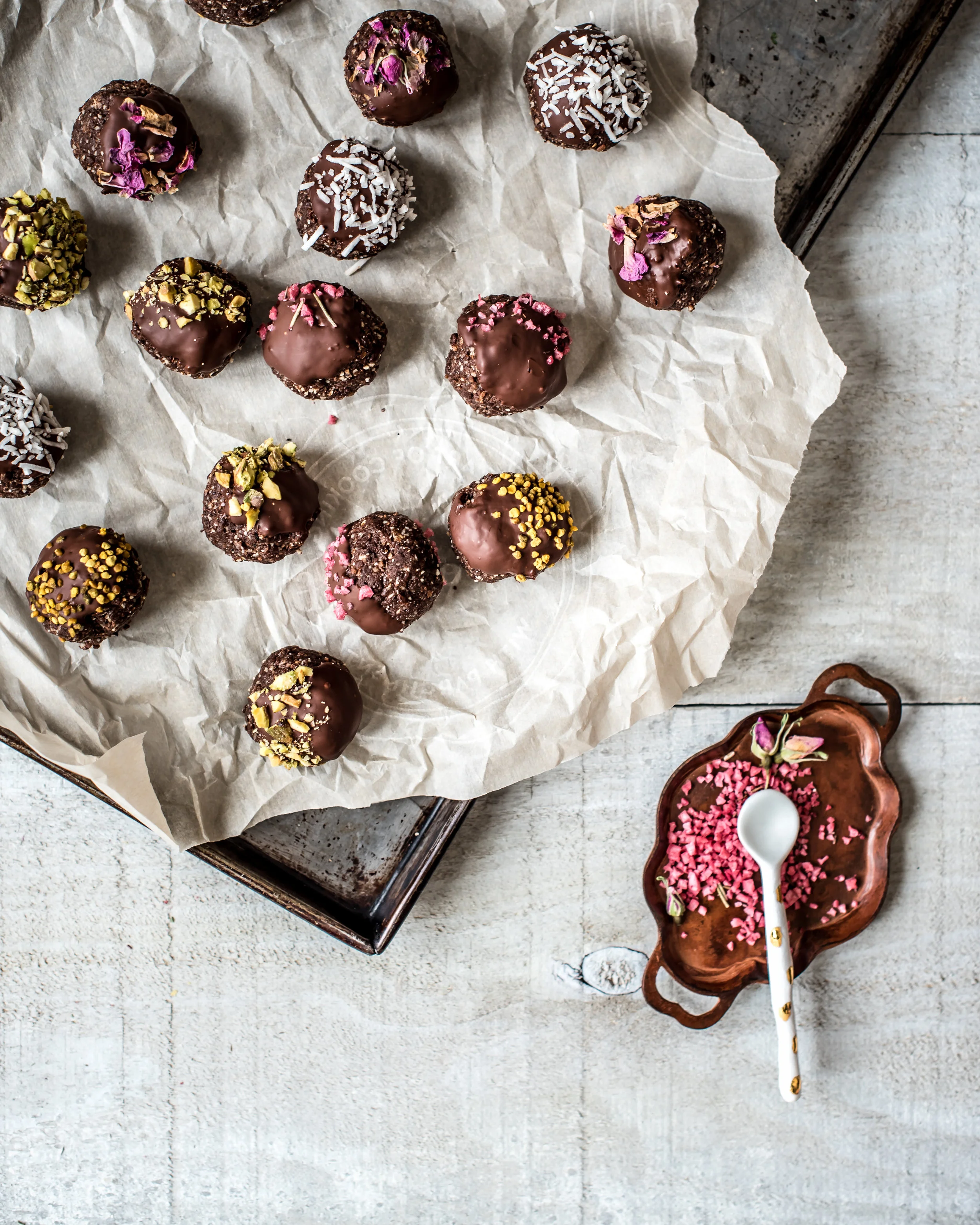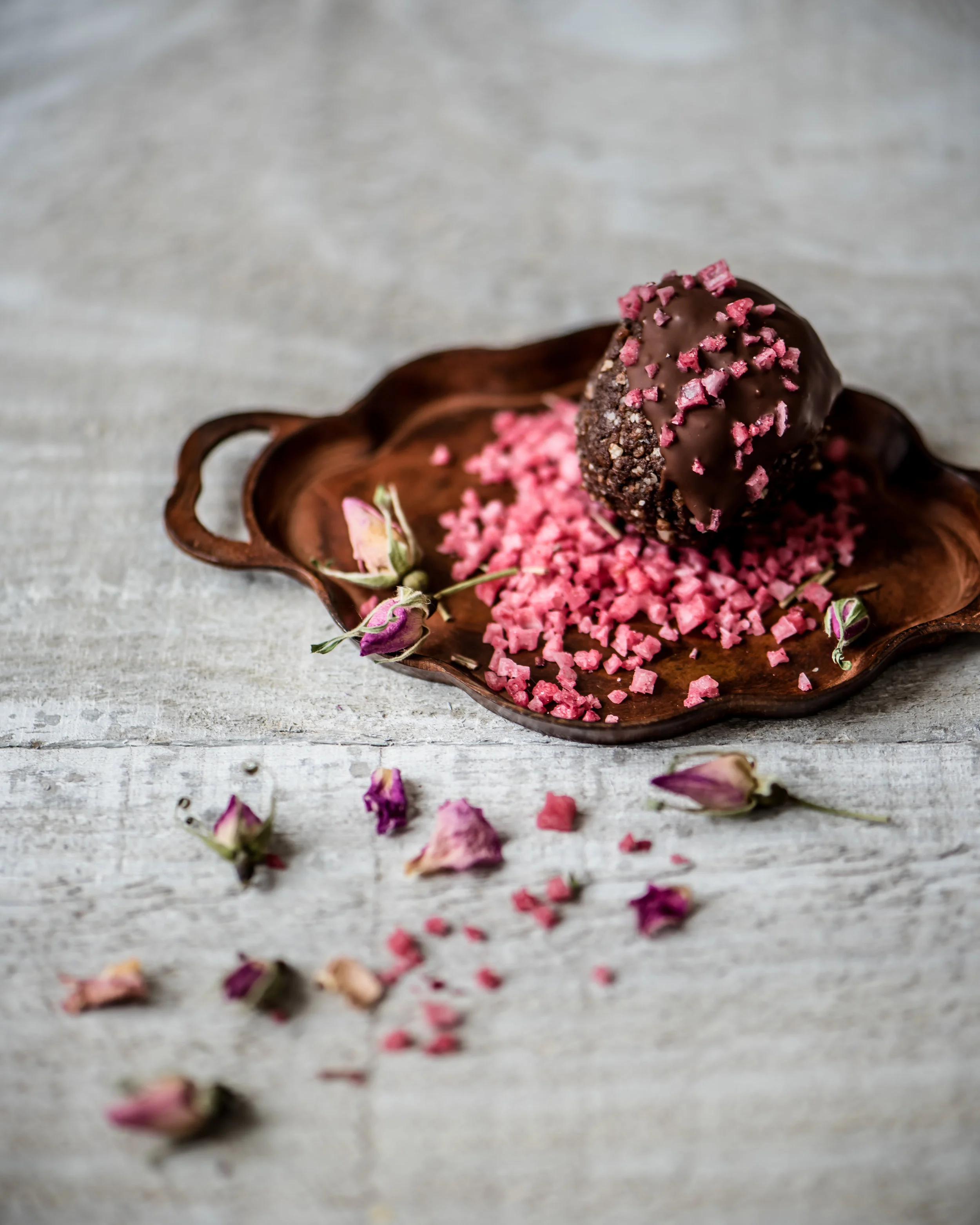 Combine all ingredients in a food processor and pulse until the batter comes together and sticks. If you find the batter is still loose, add a tablespoon of water and pulse. Form the batter into small balls. If you wanted to be extra fancy, you could coat the energy balls in some melted chocolate and sprinkle with some fun toppings. I like to use bee pollen, pistachios, wild rose petals, coconut flakes, or some falvoured salt like raspberry.