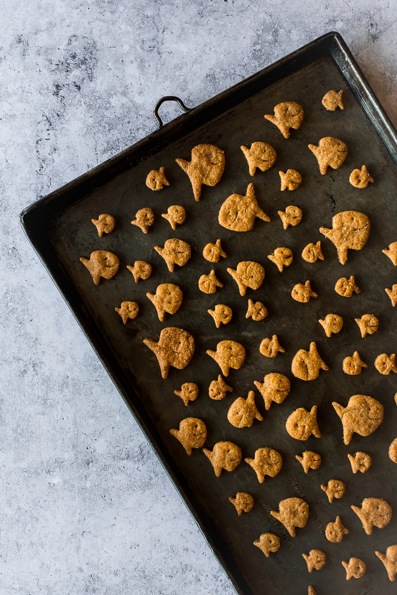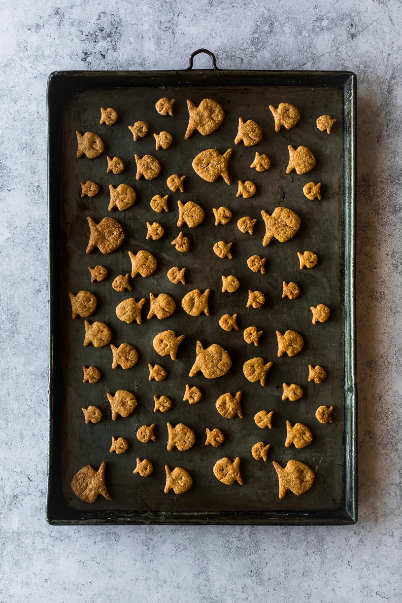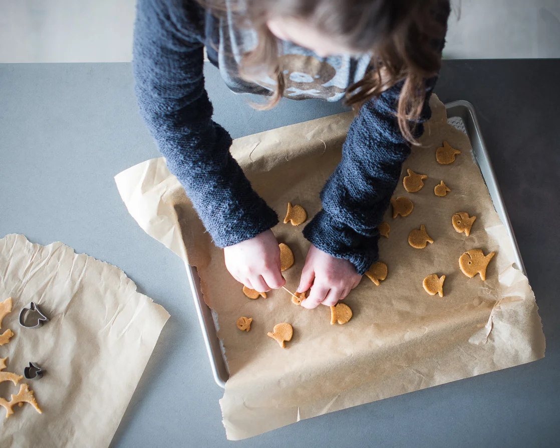 Working with half of the dough at a time. Roll out the dough on parchment paper to 1/8 inch thickness. Cut into desired animal shape. If making goldfish, use the tip of a toothpick to make the eye and press the toothpick lengthwise to make a smile.