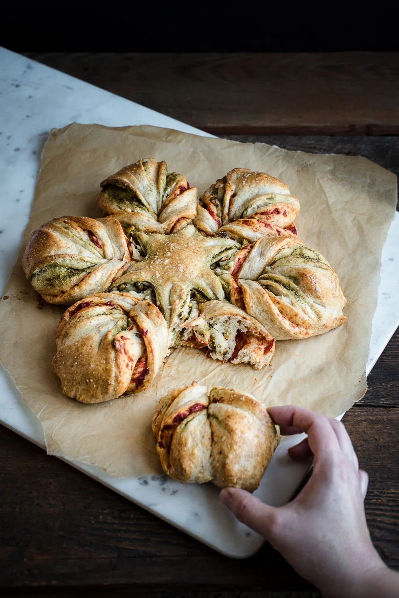Savory Holiday Star Bread with Roasted Red Peppers, Basil Pesto, Asiago Cheese and Pistachios