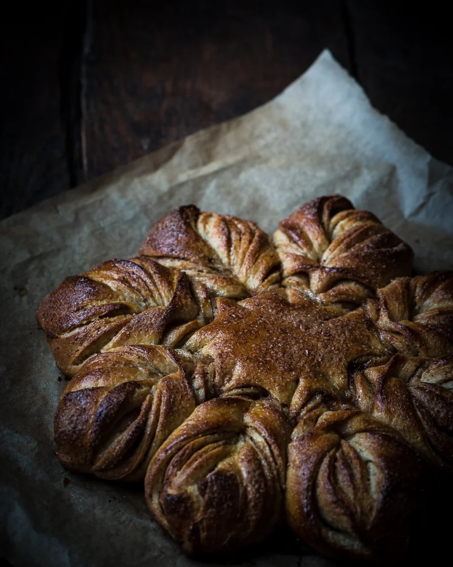 Using a cup as a guide, place in the centre of the dough. Cut the dough into four equal parts, stopping at the edge of the cup. Cut each quarter section twice more so you are left with 12 slices (this will make a 6 point star, if you’d like a 8 point star, cut each quarter into four slices). Pick up two slices (one in each hand) and twist the strands outwards twice and pinch the two twists closed together. Repeat until all slices have been twisted and combined.
