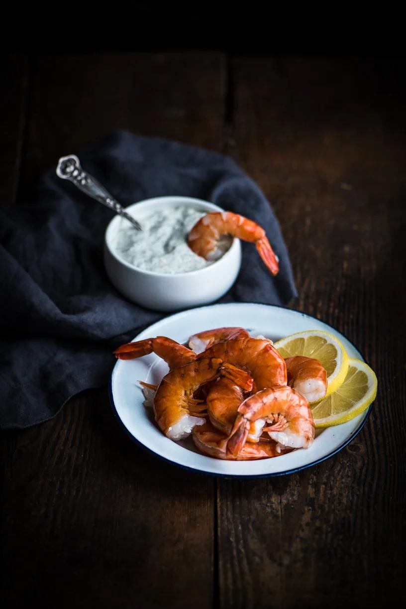 Citrus Poached Shrimp with Lemon Dill Horseradish Dipping Sauce